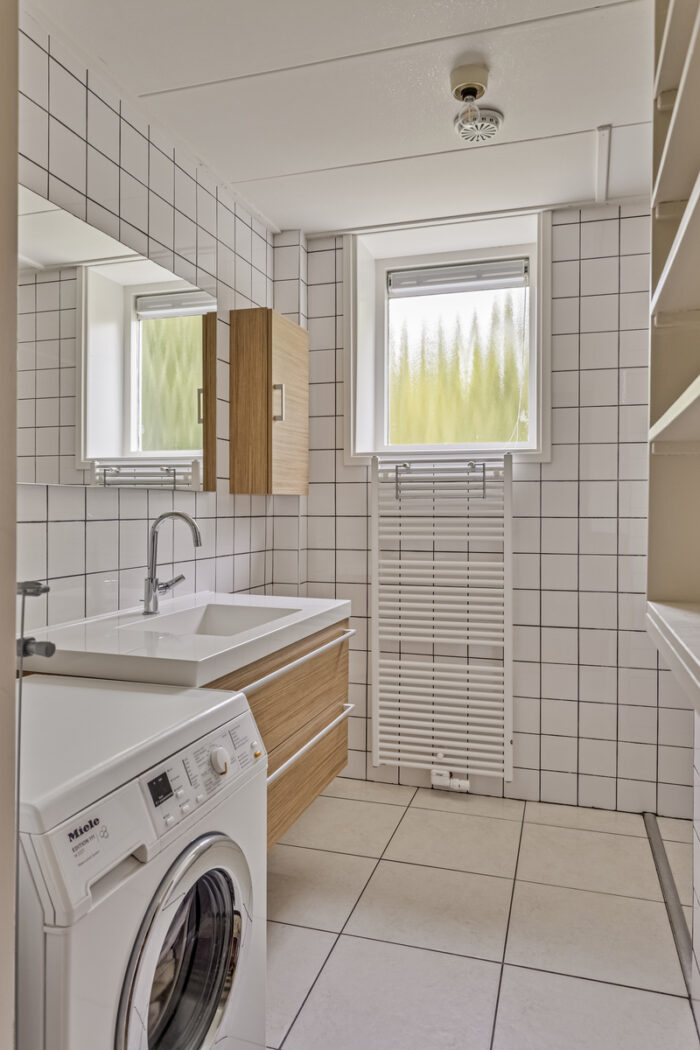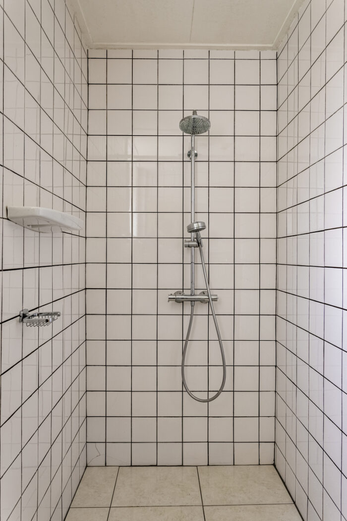 Kleedruimte, douche, toilet, urinoir, 2 wastafels en berg- en wasgelegenheid.