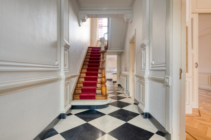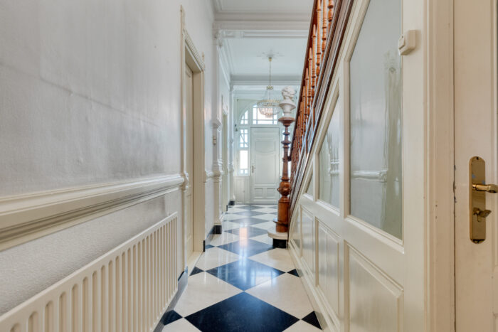 Via de statige entree met rondboogportiek betreedt u de indrukwekkende hal, waar originele lambrisering, een natuurstenen vloer en een monumentale bordestrap ware blikvangers zijn.
