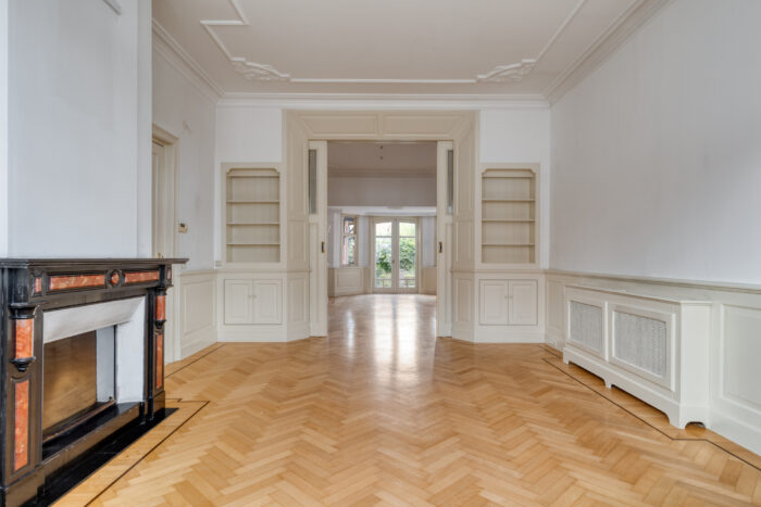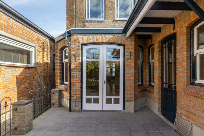 De sfeervolle woonkamer en suite is voorzien van een klassieke visgraat-parketvloer, originele marmeren schouw in Belgisch zwart en Doornik rood, die de open haard omgeeft met veilige liftdeur en voorzien is van een dubbelwandige metalotherm schoorsteenkaneel, met extra warmte via de begeleidende roosters in zowel kamer als badkamer op de eerste verdieping. De schuifdeuren met rijkelijk gedecoreerd geëtst glas verdelen de ruimte in een comfortabel zitgedeelte met erker, en een ruime eetkamer, voorzien van inbouwkasten aan beide zijden. De openslaande tuindeuren leiden naar een verhoogd tuinterras, waarop ook de keuken aansluit. Dit verhoogde tuinterras heeft een monumentaal overstek, karaktervol en praktisch, waaronder zich ook de twee buitenkasten bevinden. Warme stijlvolle vertrekken kortom, die u uitnodigen tot ontspannen binnen én buiten.