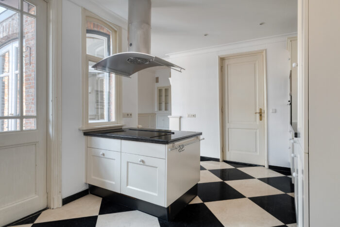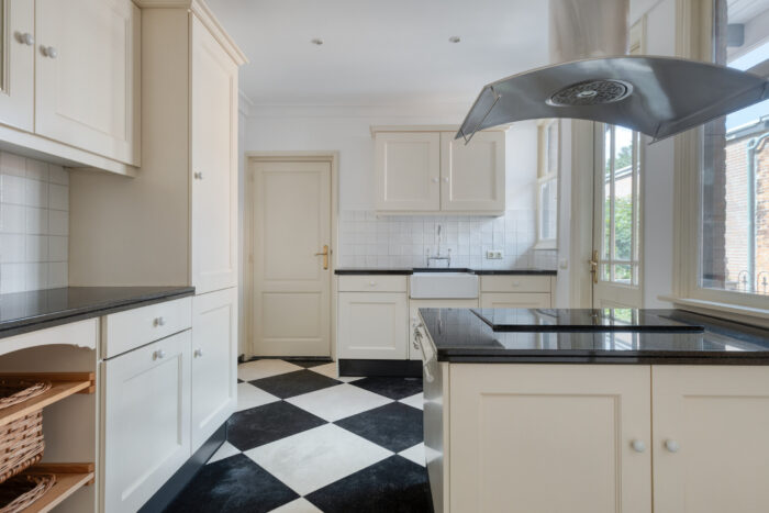 In open verbinding met de eetkamer vindt u de fraaie Tinello-keuken, met natuurstenen werkbladen, kookeiland en hoogwaardige inbouwapparatuur. Aansluitend een portaal met toegang tot de wasruimte en een zeer ruim toilet. Vanuit de hal is ook de praktische binnenkelder bereikbaar, ideaal voor bijvoorbeeld wijnopslag. In die binnenkelder vindt u ook de originele Lipskluis.