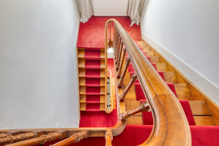 Via de originele essenhouten trap met borduren en wrongstukken, passeert u het prachtige glas-in-lood raam dat de overloop siert. De royale hoofdslaapkamer is licht en sfeervol, voorzien van shutters en ingebouwde kledingkast met schuifdeuren. Daarop sluit aan de bijzonder ruime badkamer met ligbad, inloopdouche, dubbele wastafel, bidet en een tweede toilet. De badkamer heeft tevens een charmant balkon. De tweede slaapkamer met inbouw kastgedeelte heeft een eigen toegang via de overloop, en geeft uit naar de badkamer.