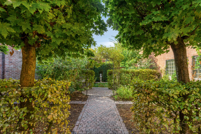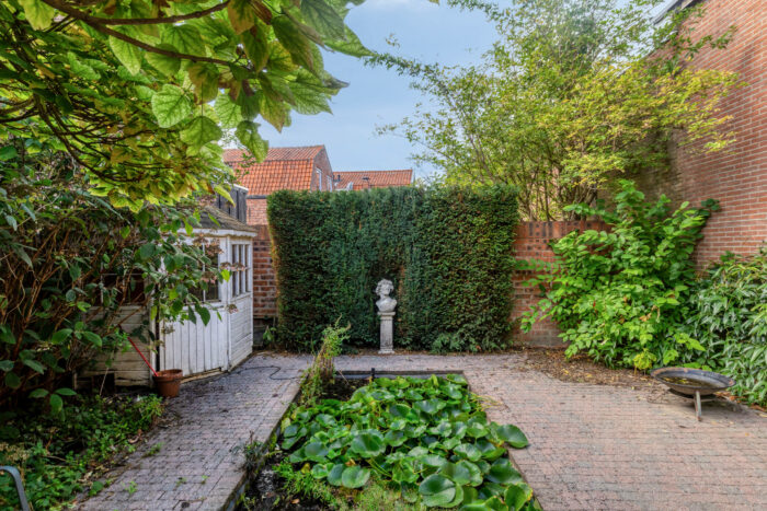 De fraai aangelegde achtertuin op het zuidwesten is een ware oase van rust, met beukhagen bloemborders, meerdere terrassen, een prieel, een sierlijke vijver en een houten tuinhuisje. Hier geniet u van optimale privacy en een groen decor.