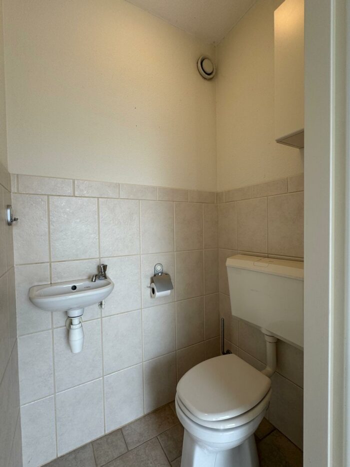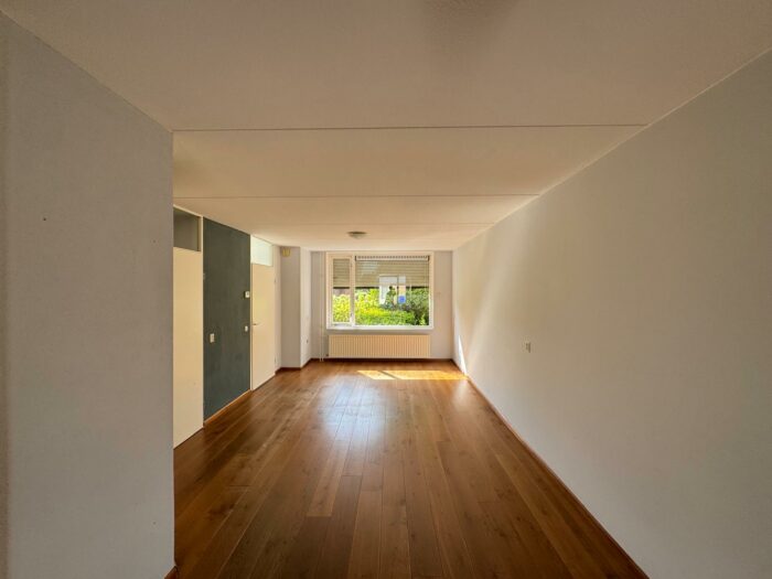 Hal met meterkast (8 groepen, dubbel tariefmeter), toilet met wastafel, ruime doorzon woonkamer (24,6m²) met houten vloer, half open keuken (5m²) met inbouw apparatuur, ruime bijkeuken met wasmachine /droger aansluiting.