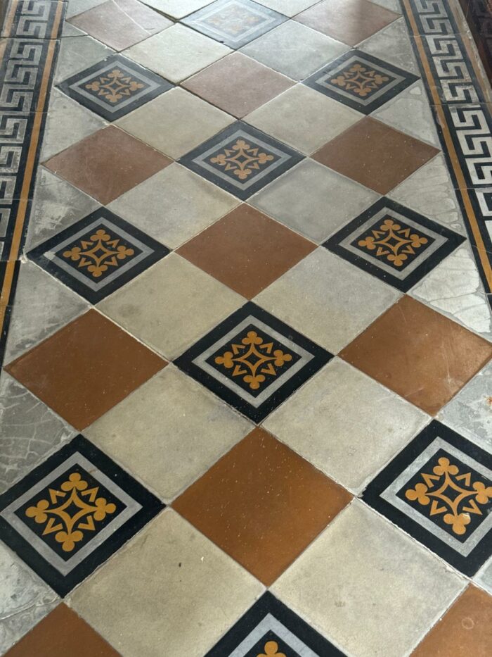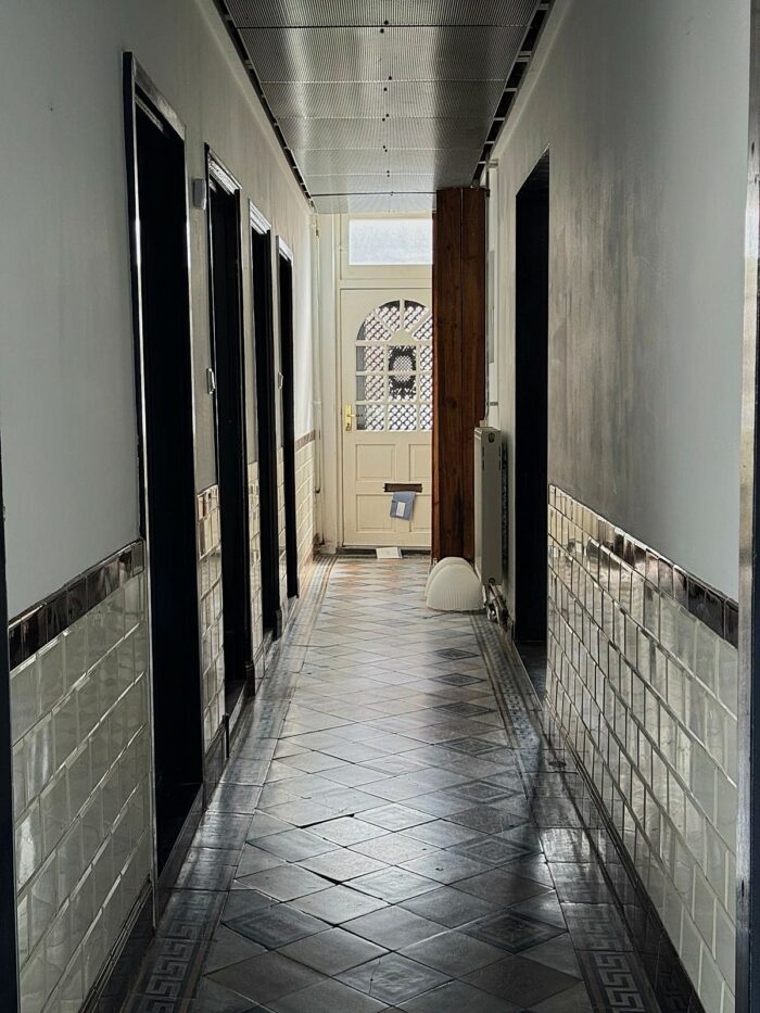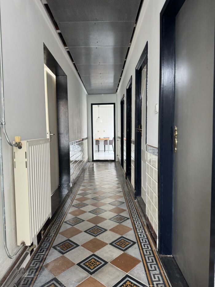 Entree via een overdekt portiek aan de zijkant van de woning. Ruime garderobe met tegelvloer en deur naar een inloopkast waar de aansluiting zit van de c.v-installatie (HRC Intergas 2013). Doorgang naar de lange hal met prachtige authentieke tegelvloer, meterkast (14gr+3F+AL) en trapopgang. Vanuit de hal toegang tot een droge kelder.