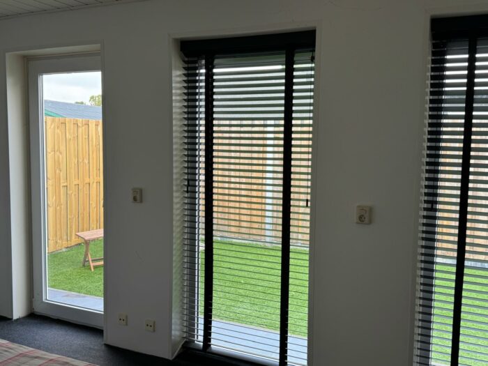 • Gedeeltelijk houten en kunststof kozijnen met dubbel glas. Eén raam met voorzetraam