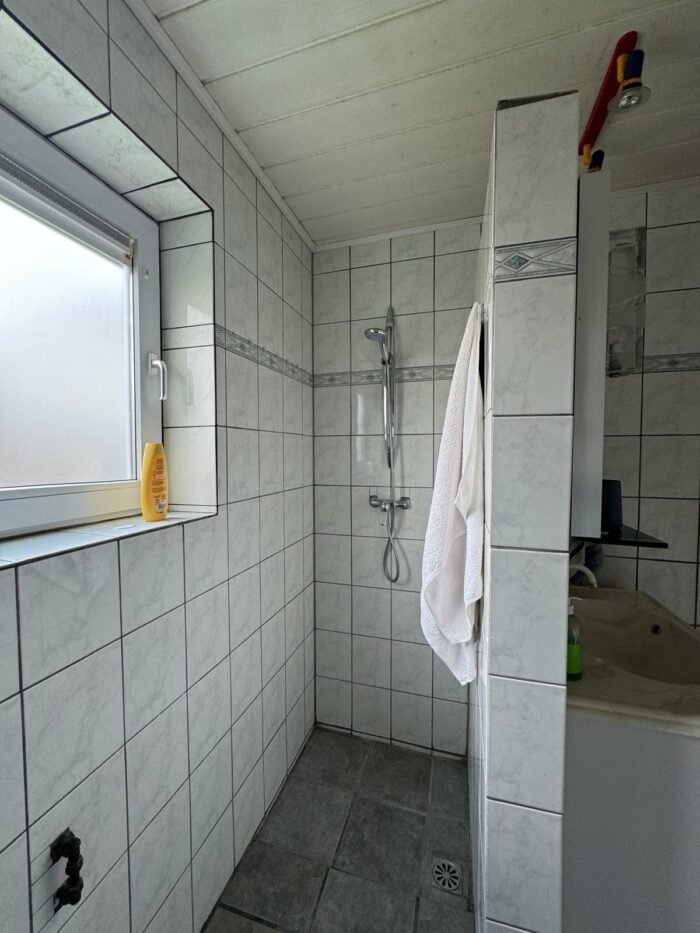 Aansluitend aan de keuken is een badkamer. Deze is voorzien van een douche, wasmeubel, toilet en aansluiting voor de wasapparatuur.