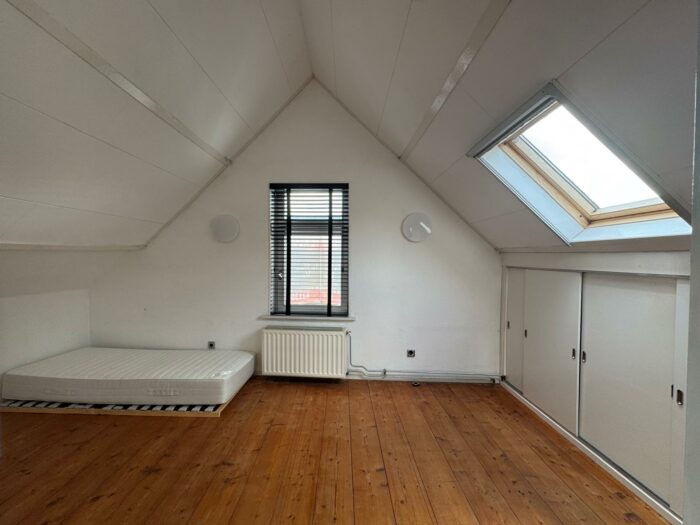 Ruime slaapkamer aan de voorzijde van de woning met grote kastenwand. Aan de achterzijde van de woning bevindt zich nog een ruime slaapkamer met bergkasten waarvan je uitzicht hebt op de tuin.