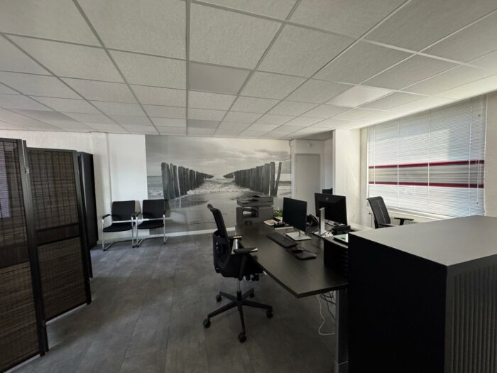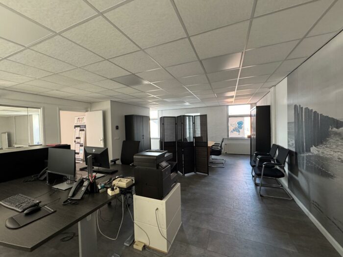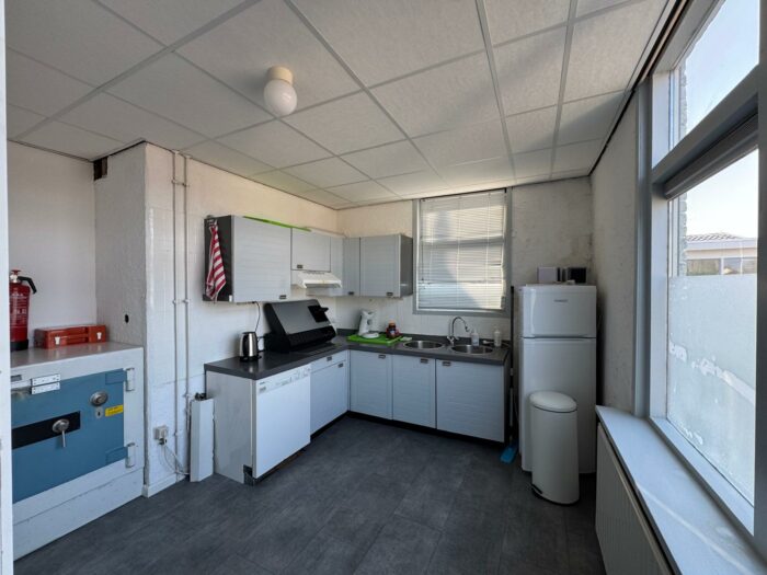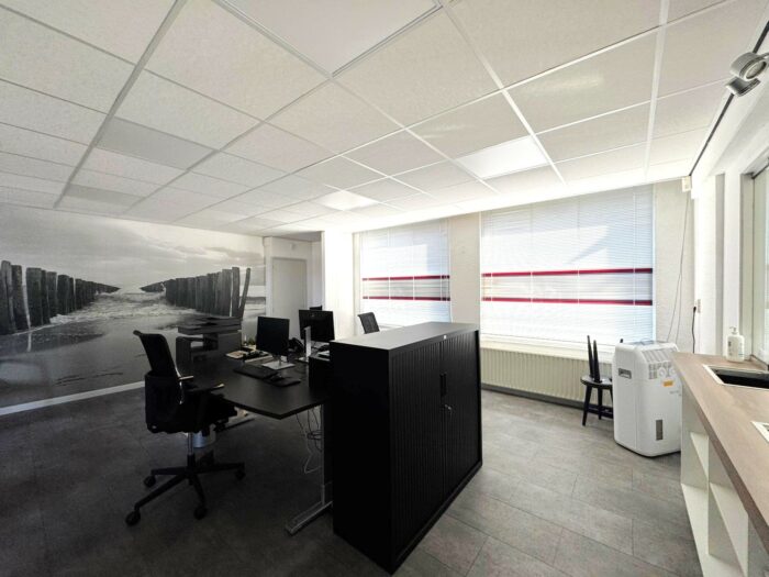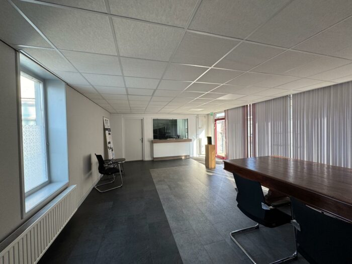 Begane grond: berging met meterkast en met vlisotrap naar 1ste verdieping, open kantoorruimte, entree, kantoorruimte met balie, toilet met wastafel, keuken, 2de meterkast.