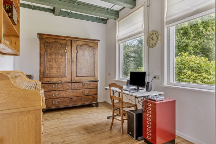 – begane grond: gang, ruime hal met meterkast, woonkamer, woonkeuken, kantoor/slaapkamer, badkamer, toilet, gang