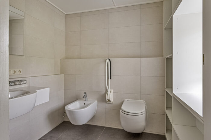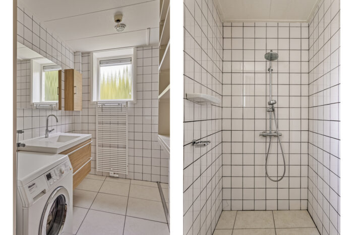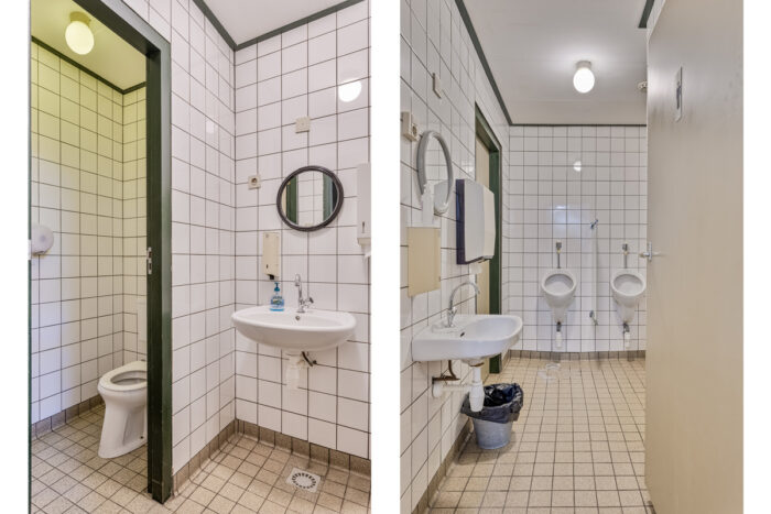 Kleedruimte, douche, toilet, urinoir, 2 wastafels en berg- en wasgelegenheid.