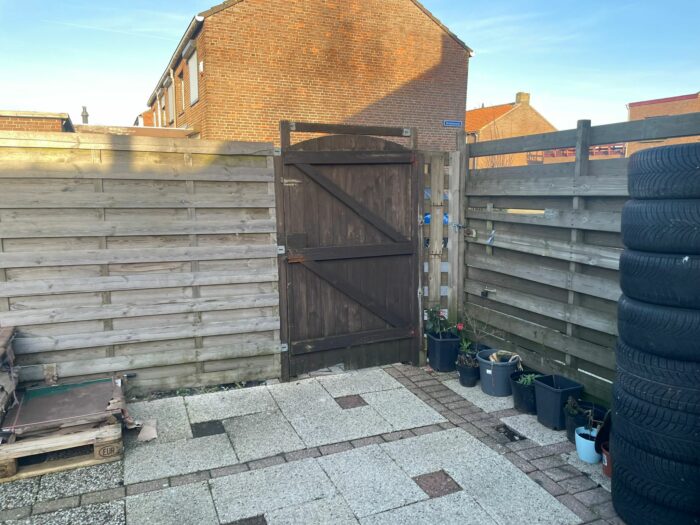 Achtertuin op het noordwesten gelegen, geheel aangelegd in terrastegels, met zijdeur naar oprit.