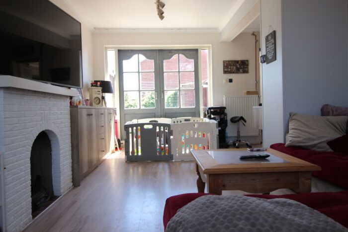 Woonkamer: L-vormige kamer met zitruimte en schouw(open haard) en openslaande tuindeuren.