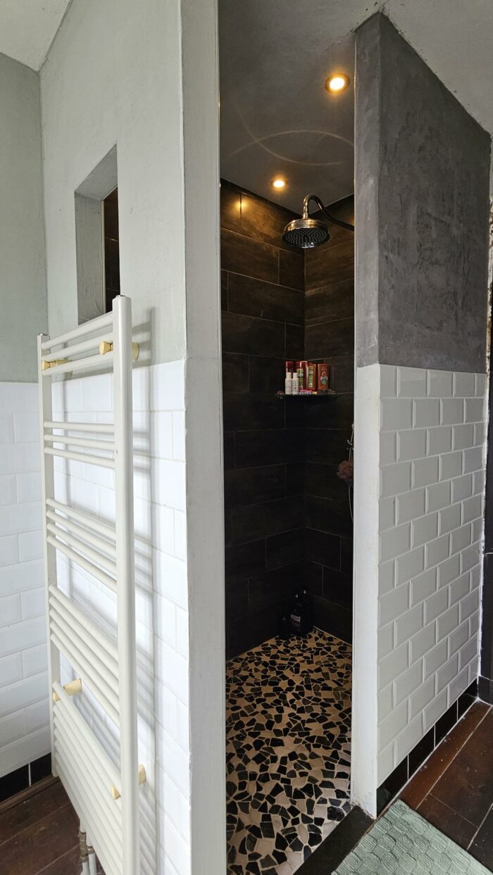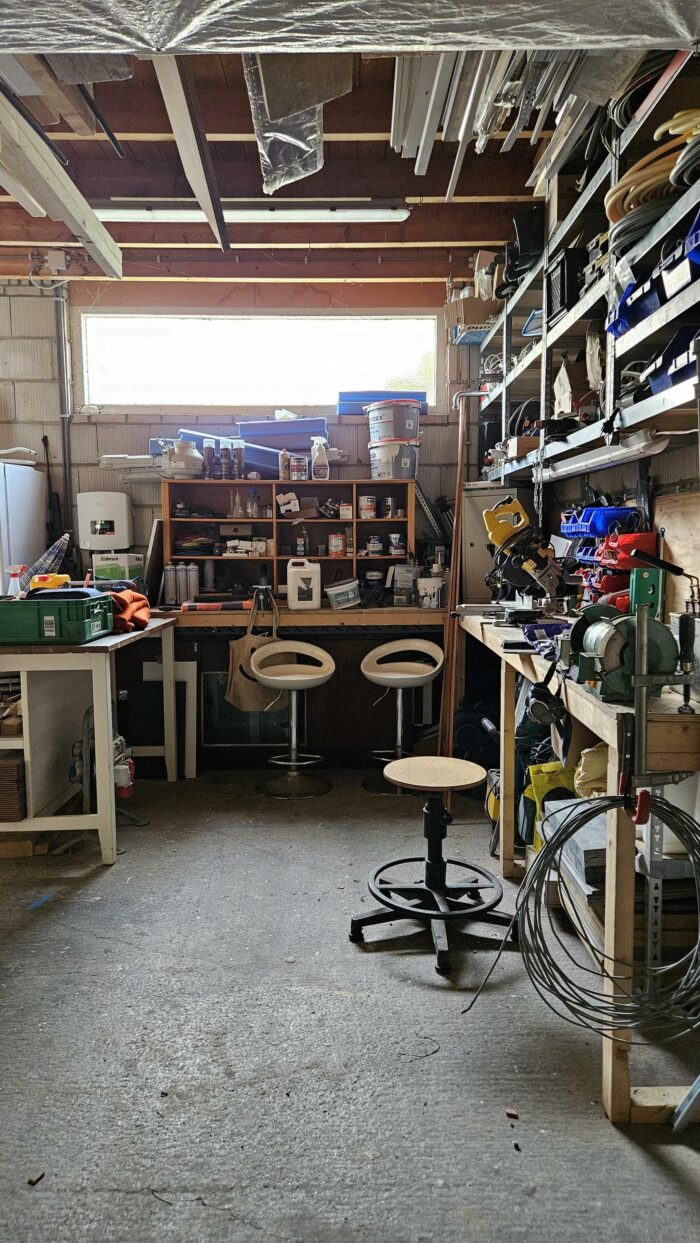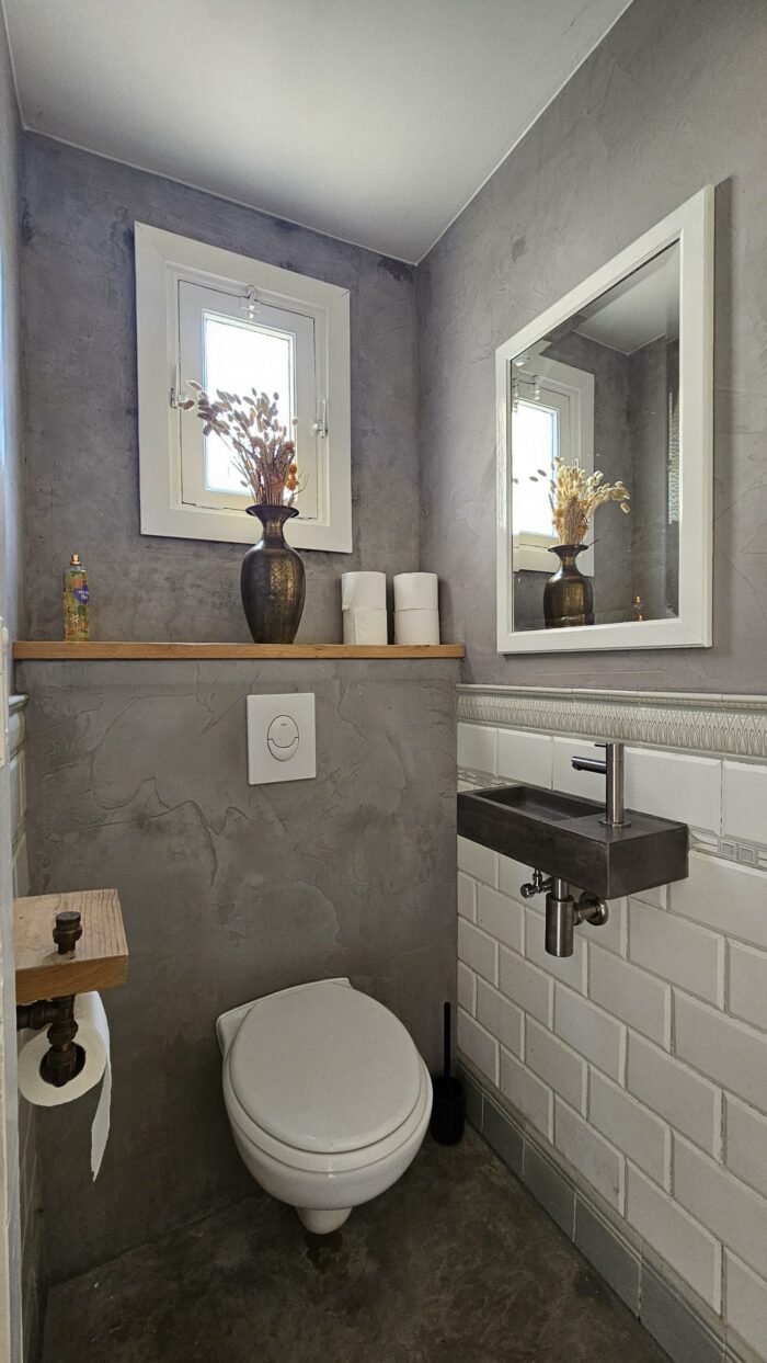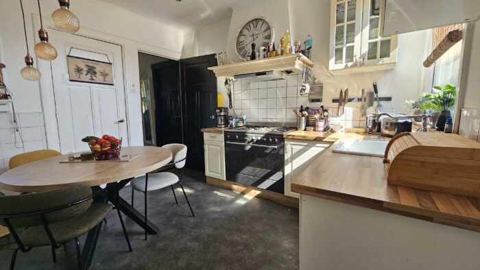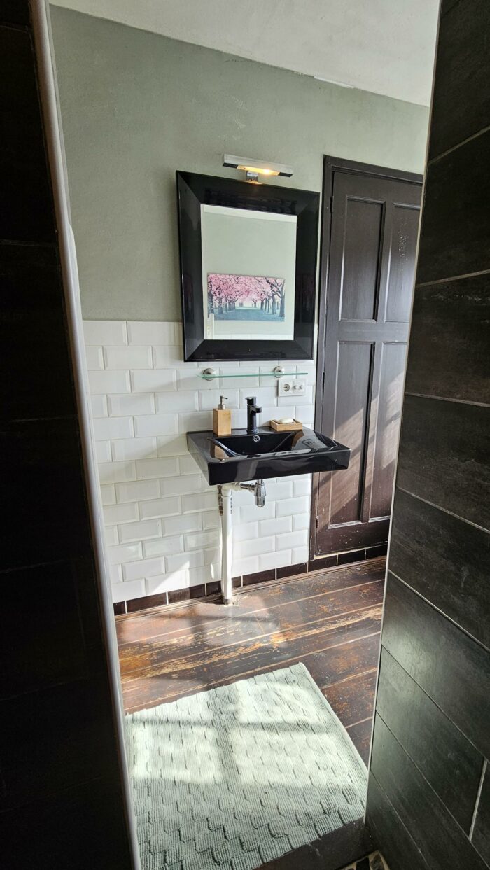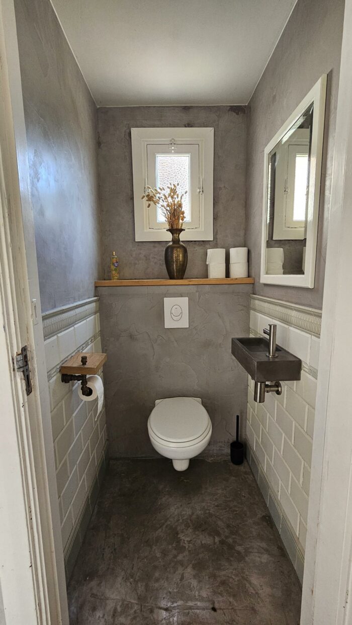 Vanuit de leefkeuken kom je in de bijkeuken die voorzien is van een wc. Achter de bijkeuken vind men de wasruimte. Hier is plek voor de wasmachine en droger. Ook hier vind je weer een stukje authenticiteit! Het lavet zit er ook nog in en tevens een doucheruimte.