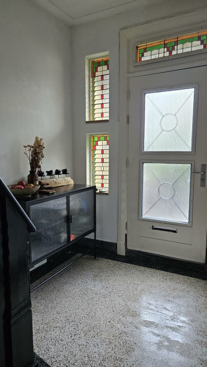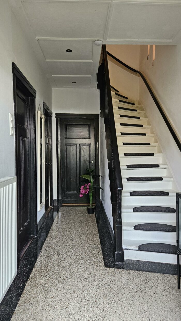 Op de begane grond vind je de prachtige authentieke hal met originele vloer, glas in lood en de statige trap naar boven.