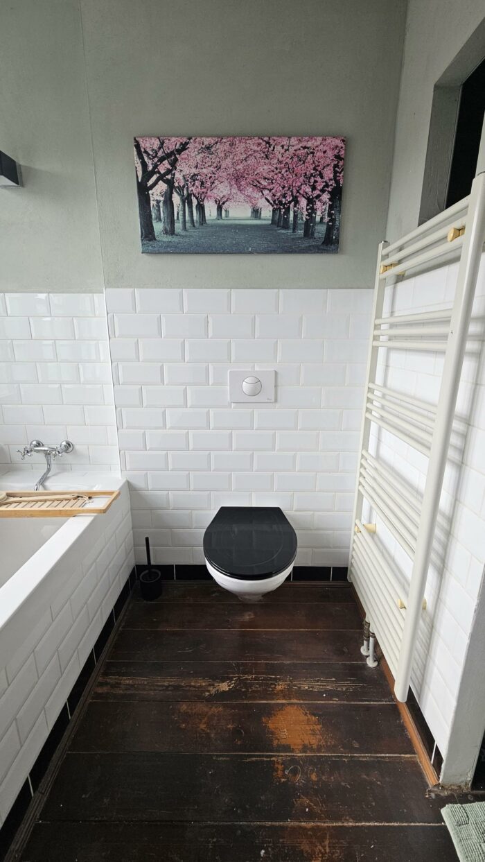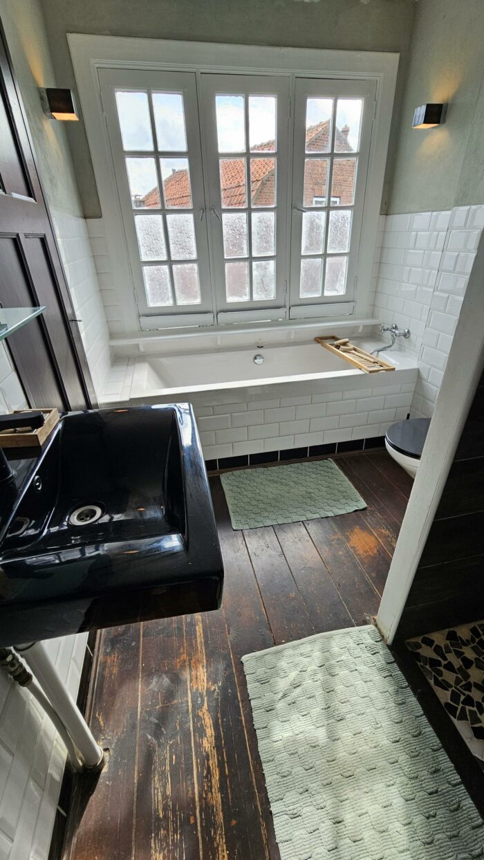 Op de 1ste verdieping vind je de badkamer met aparte douche, ligbad en wc.