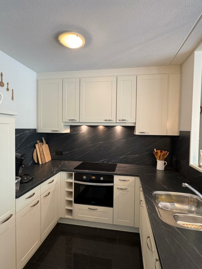 Open keuken in U-opstelling met inbouwapparatuur: oven, inductie kookplaat, afzuigkap, vaatwasser en koelkast.