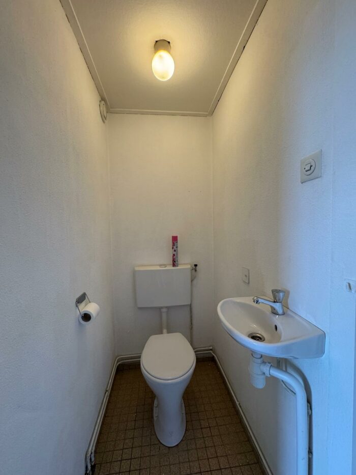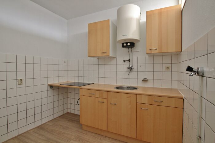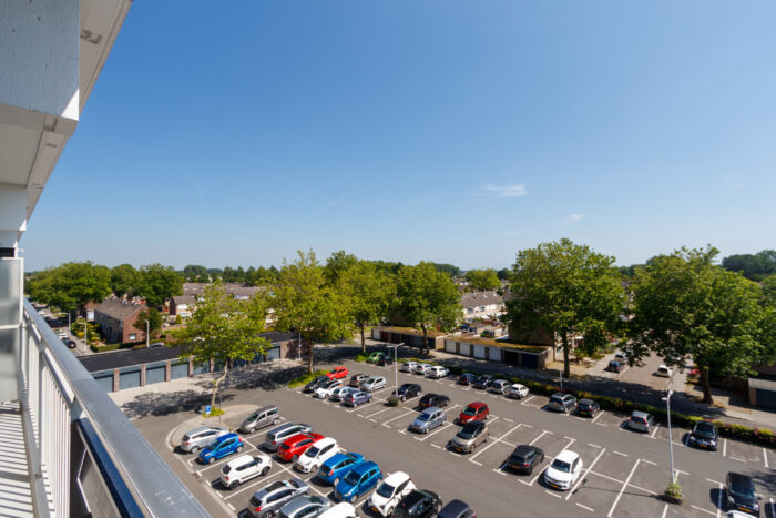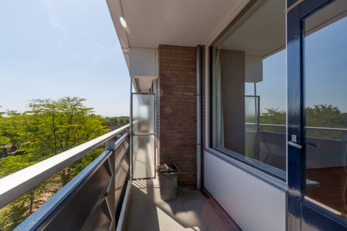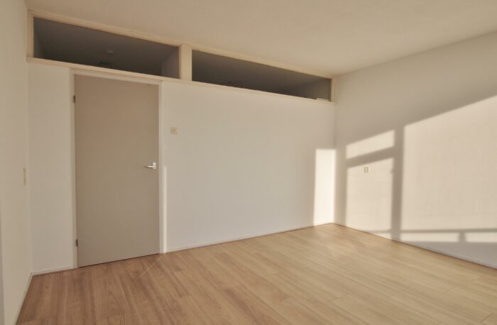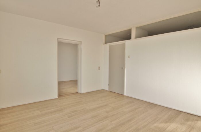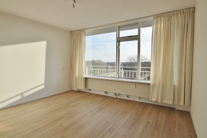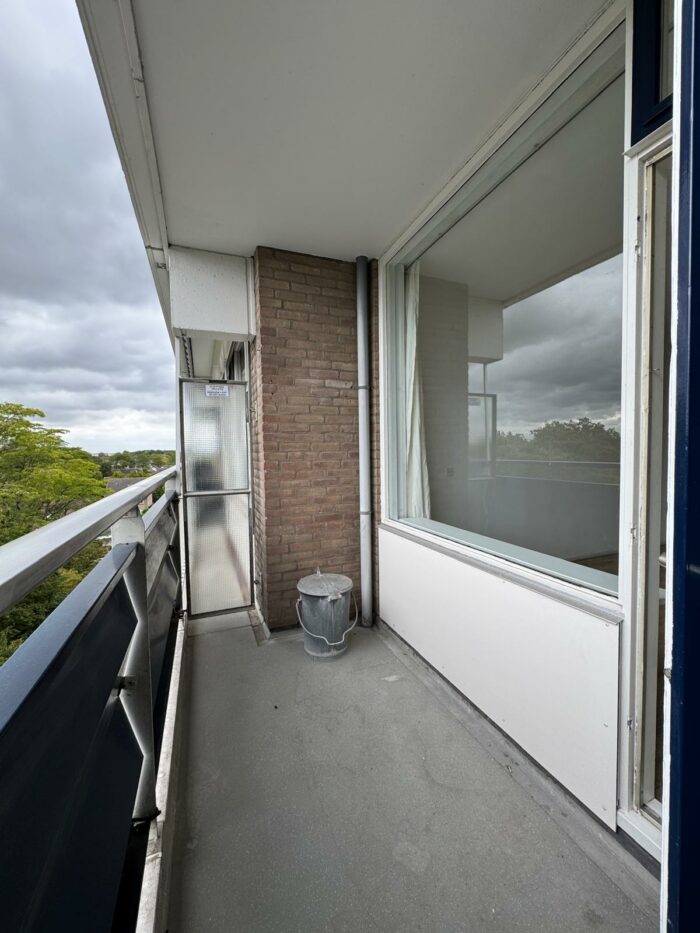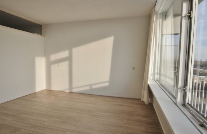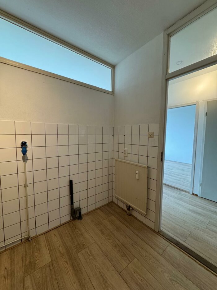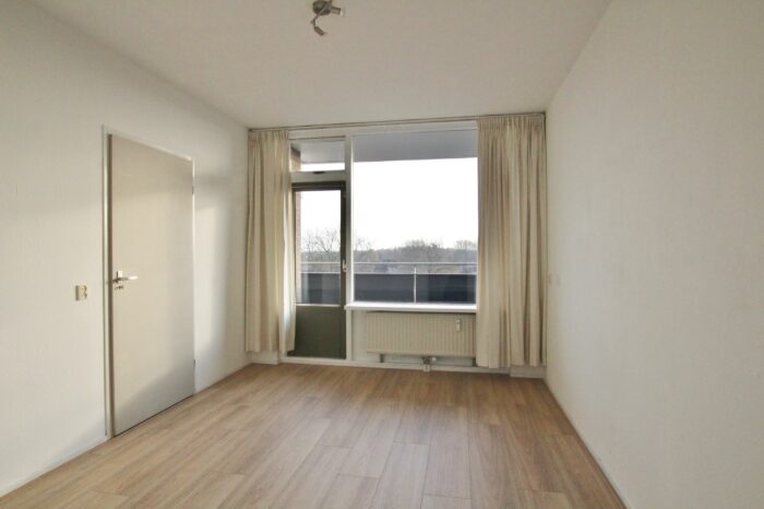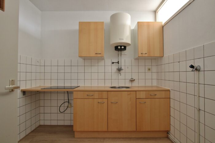 Hal met toilet, ruime lichte woonkamer (4×4,3m) met laminaatvloer, keuken met een degelijk keukenblok v.v. inductie kookplaat, boiler en aansluiting voor de wasmachine, ruime slaapkamer met laminaatvloer, balkondeur en toegang tot de badkamer met wastafel en een douchehoek.
