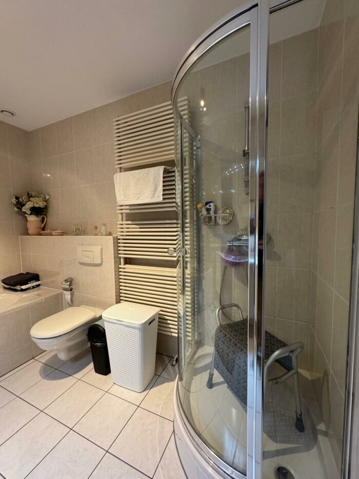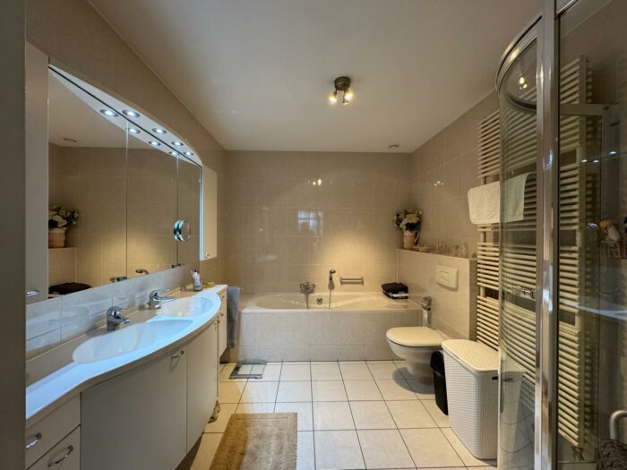 Badkamer: volledig betegeld en voorzien van een hangtoilet, wastafel, douchecabine, ligbad en designradiator.